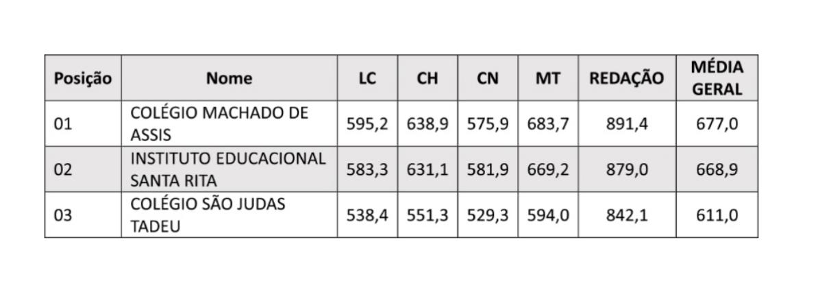 As três escolas, obtiveram as maiores médias entre as instituições sediadas em Picos com 10 ou mais alunos concluintes, critério utilizado para garantir maior representatividade estatística e evitar distorções nos dados.