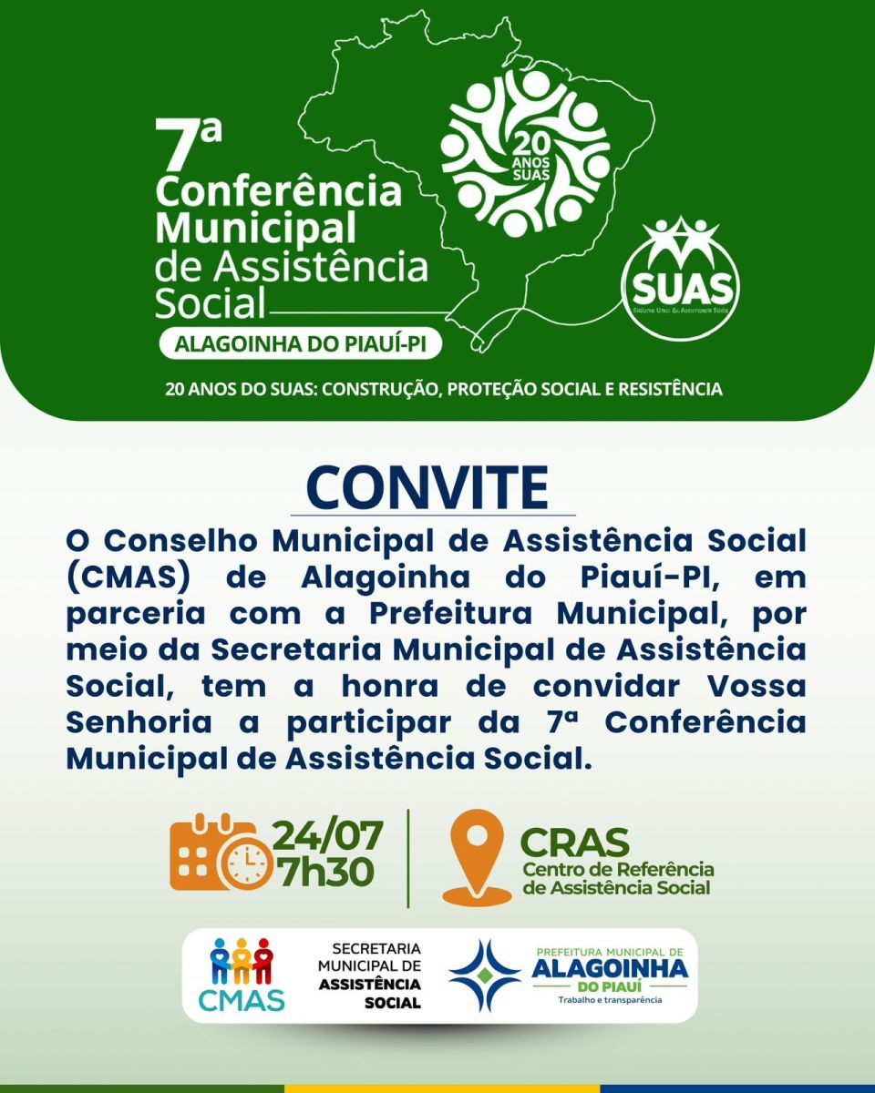 A Prefeitura de Alagoinha do Piauí, por meio da Secretaria Municipal de Assistência Social e do Conselho Municipal de Assistência Social (CMAS), promove nesta quinta-feira (24), a 7ª Conferência Municipal de Assistência Social, que será realizada na sede do CRAS, com início às 7h30.