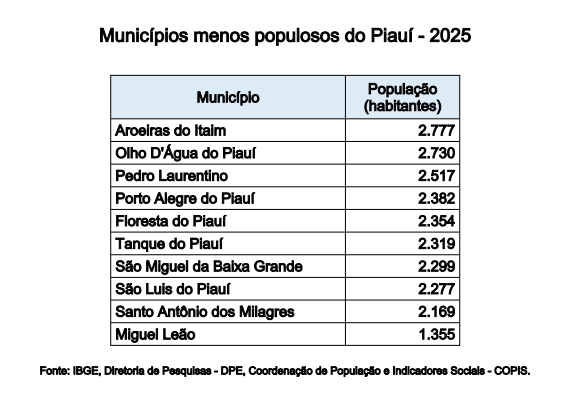 Em 2025, no Piauí, 159 municípios apresentam uma população de até 10 mil habitantes, o que representa 70,9% do total de municípios do estado, sendo que desses municípios um total de 77 deles tinha ate 5 mil habitantes (34,3%) e outros 82 municípios tinha mais de 5 mil até 10 mil habitantes (36,6%).
