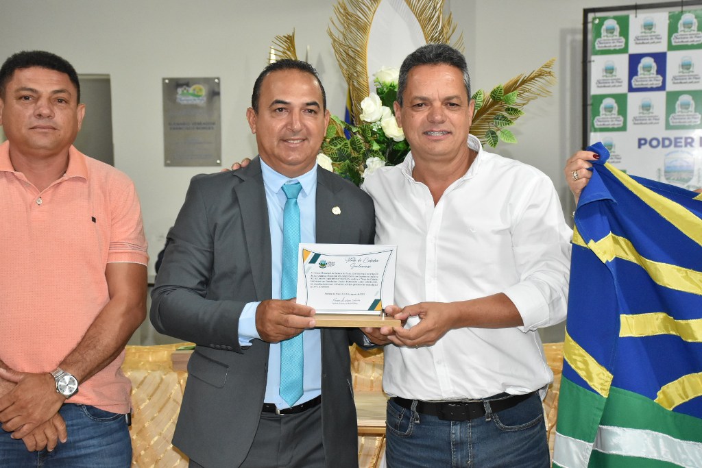 Já o prefeito de Santana do Piauí, Adonaldo Cassiano, parabenizou os agraciados com tamanha honraria, destacando que estes passam a pertencer à terra santanense e tem a missão de também cuidá-la. “Como representante do Poder Executivo parabenizo presidente Netinho e os demais vereadores pela grandeza desta noite de homenagem. Aos agraciados, Valéria, Rodrigo, prefeito Pablo e Fabrício, saibam que recai sobre cada um de vocês um compromisso maior de hoje em diante, pois ser filho de Santana exige zelo, dedicação, amor e honra a esta terra. Cada vereador e vereadora que lhes concedeu tamanha honra viu em vocês a marca de ser santanense por convicção e amor. Parabéns, juntos faremos nossa Santana cada vez melhor”, comentou.
