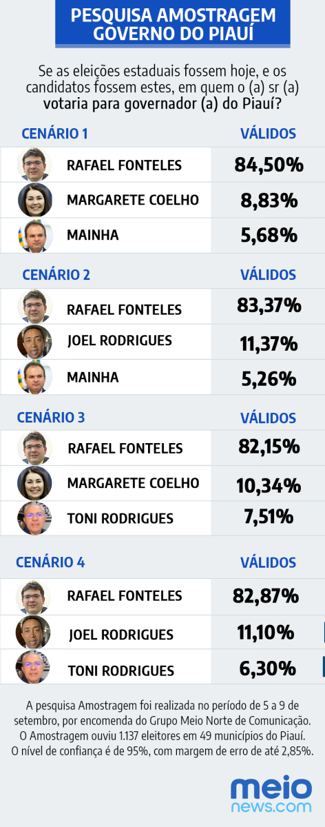 O Amostragem testou quatro cenários na pesquisa estimulada, considerando os nomes colocados hoje como possíveis candidatos ao Palácio de Karnak. Em cenário concorrendo contra Margarete Coelho (Progressistas) e Mainha (PL), Rafael teria hoje 84,50% dos votos válidos. Margarete ficaria com 8,83% e Mainha com 5,68%. Os dados consideram as respostas válidas, excluindo os entrevistados que disseram não saber em quem votar ou não quiseram responder.