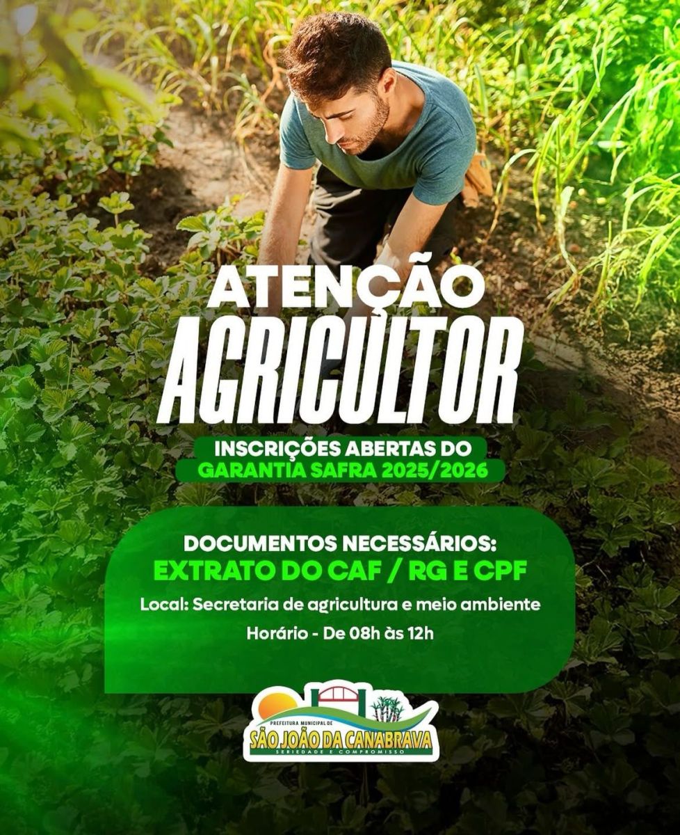 A Prefeitura Municipal de São João da Canabrava, por meio da Secretaria de Agricultura e Meio Ambiente, informa que as inscrições para o programa Garantia Safra 2025/2026 estarão abertas a partir desta terça-feira, 30 de setembro.