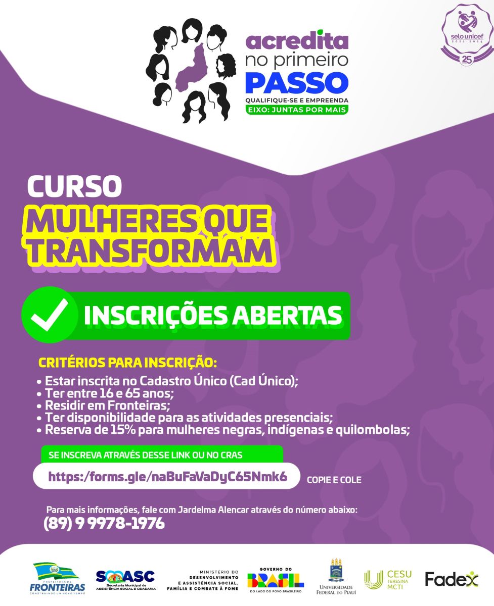A Prefeitura de Fronteiras, através da Secretaria Municipal de Assistência Social e Cidadania, abriu as inscrições para o curso Mulheres que Transformam, que faz parte do Projeto Acredita no Primeiro Passo: Juntas por Mais.
