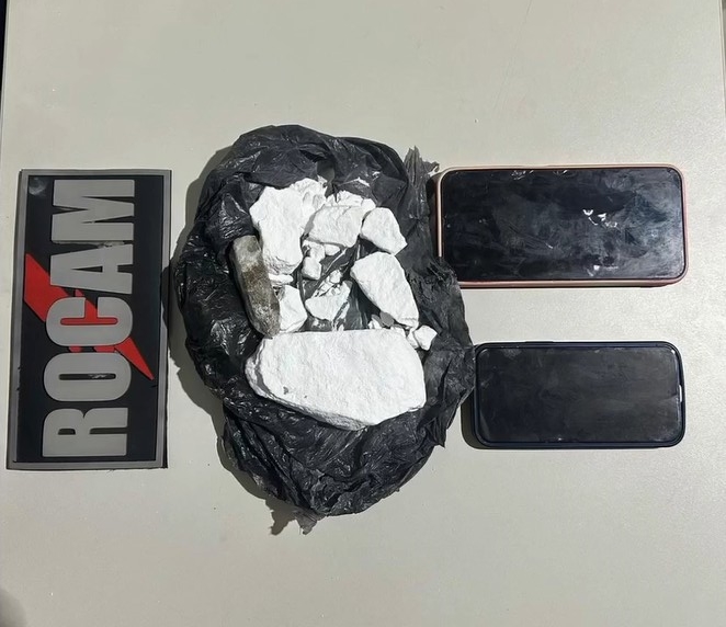 Durante a busca pessoal e varredura no local, os policiais localizaram um saco plástico com substância análoga à cocaína e um invólucro médio de substância análoga à maconha. Também foram apreendidos dois aparelhos celulares e uma motocicleta modelo Pop 110.