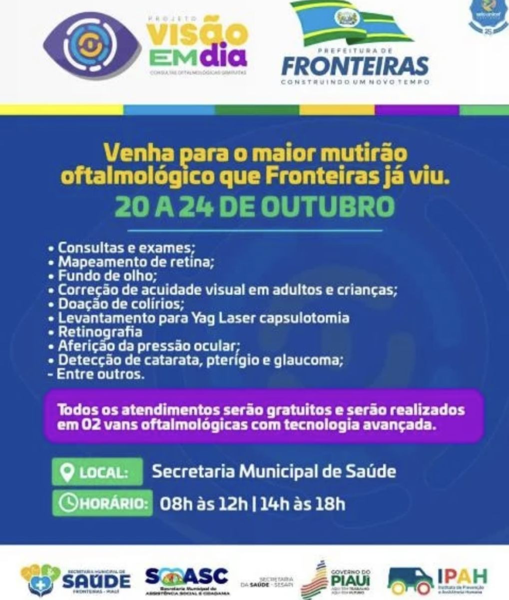 A cidade de Fronteiras se prepara para receber uma importante ação de saúde voltada ao cuidado com os olhos. Entre os dias 20 e 24 de outubro, será realizado o Projeto Visão em Dia, uma iniciativa da Prefeitura Municipal, sob a gestão do prefeito Eudes Ribeiro, em parceria com o Governo do Estado, por meio da Secretaria de Estado da Saúde (SESAPI). A ação acontece das 08h às 12h e das 14h às 18h, com uma ampla oferta de serviços gratuitos à comunidade.