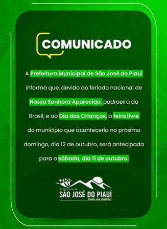 A Prefeitura de São José do Piauí emitiu um Comunicado informando a população que a tradicional Feira Livre que acontece aos domingos, será antecipada, esta semana, para o sábado (11).