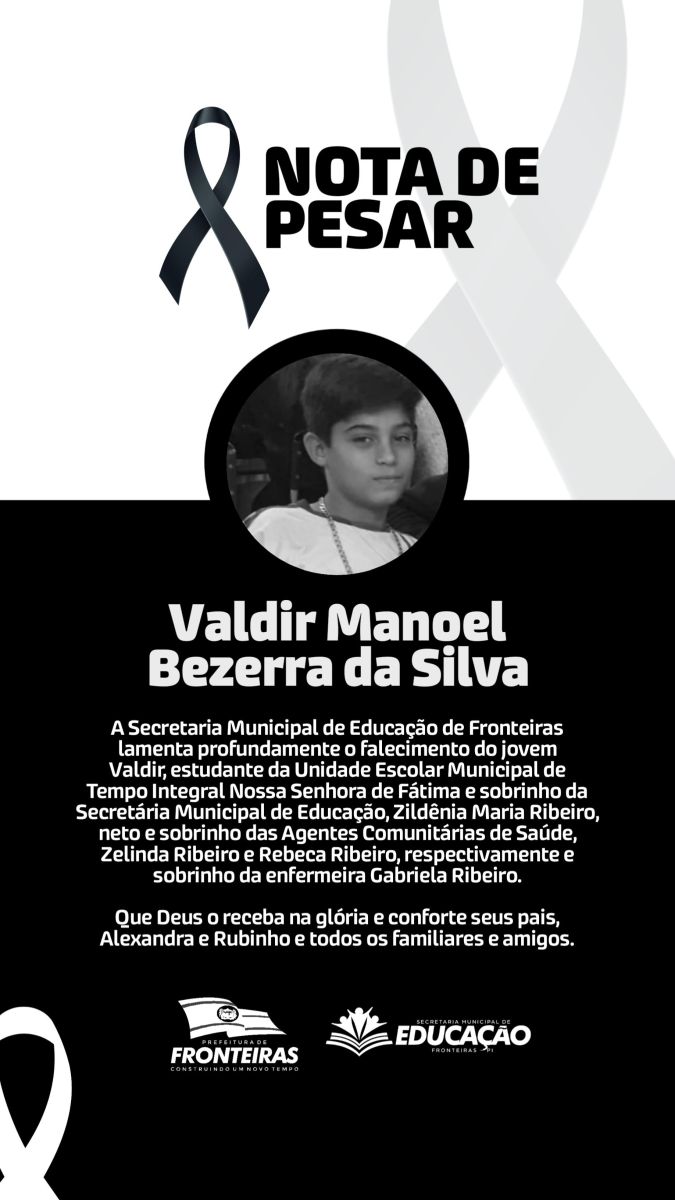 A cidade de Fronteiras amanheceu em luto nesta quinta-feira (16) com a notícia do falecimento do adolescente Valdir Manoel Bezerra da Silva, de 13 anos. O jovem era aluno da Unidade Escolar Municipal de Tempo Integral Nossa Senhora de Fátima e deixou familiares, amigos, colegas e professores profundamente consternados.