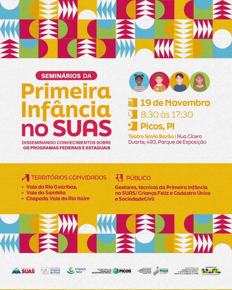 Picos será sede, nesta quarta-feira (19 de novembro), do Seminário da Primeira Infância no SUAS (Sistema Único de Assistência Social). O evento reunirá gestores, técnicos e representantes da sociedade civil para debater e disseminar conhecimentos sobre políticas públicas e programas federais e estaduais voltados à primeira infância. A programação ocorrerá no Teatro Sávio Barão, das 8h30 às 17h30, e contará com a participação de profissionais dos territórios Vale do Rio Guaribas, Vale do Sambito e Chapada Vale do Rio Itaim.