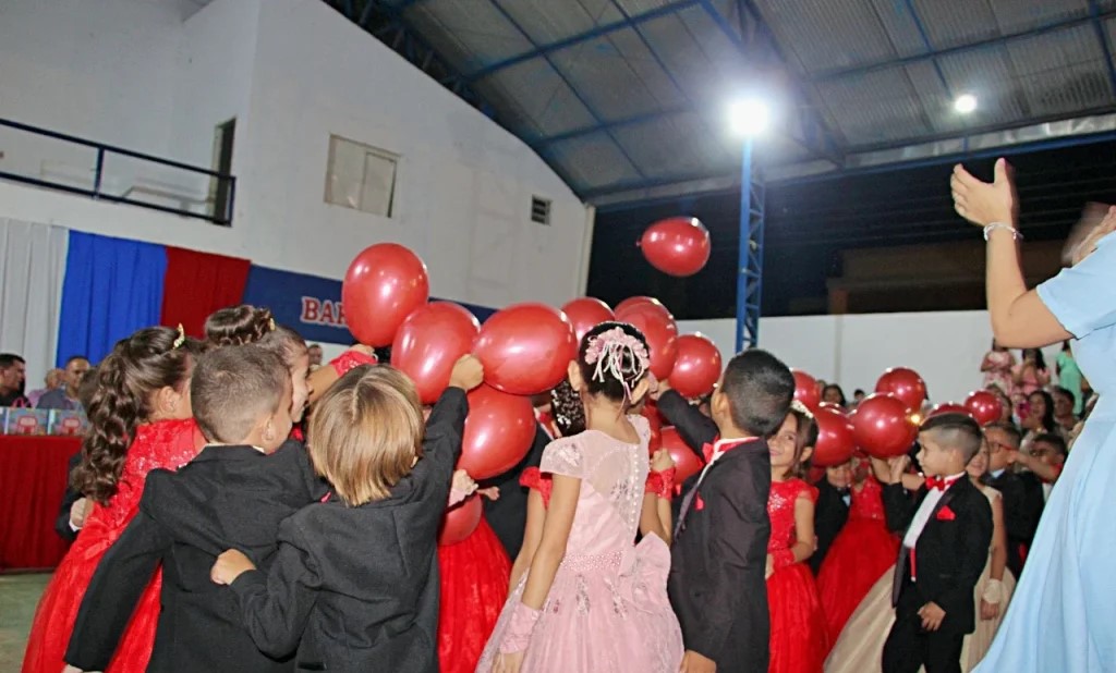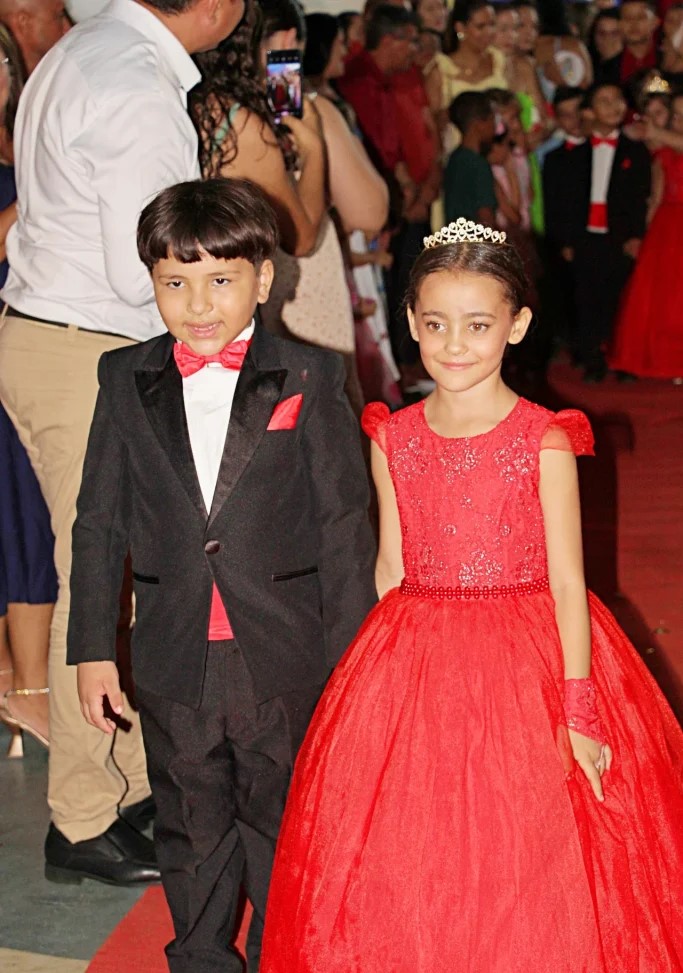 Em seguida, os formandos foram conduzidos ao espaço central da quadra, sendo anunciados nominalmente junto aos seus padrinhos e madrinhas. O público acompanhou com emoção a entrada das crianças, que concluíram a Educação Infantil no ano letivo de 2025.