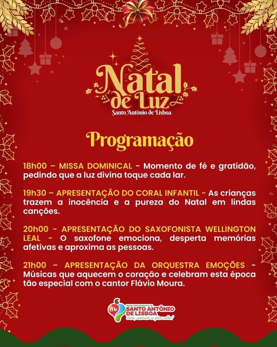 A Prefeitura de Santo Antônio Lisboa convida a população para participar da abertura do Natal de Luz, que acontecerá no próximo domingo (30), a partir das 18h00min.