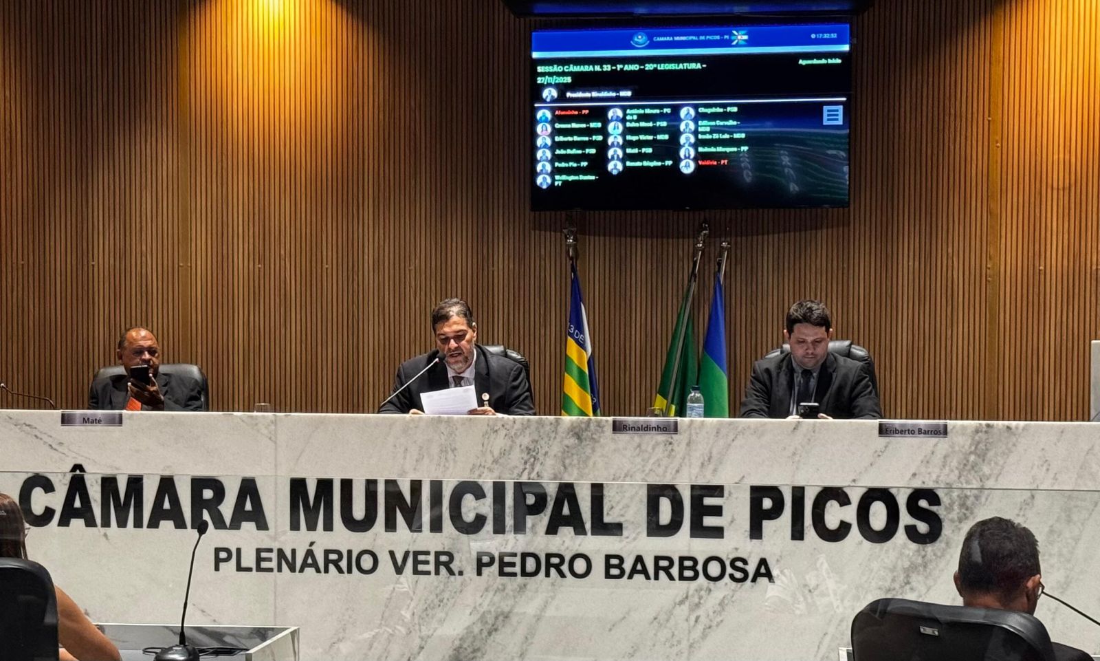 A Câmara Municipal de Picos realizou, na tarde desta quinta-feira, 27 de novembro, a 33ª Sessão Ordinária do ano, no plenário Vereador Pedro Barbosa da Silva. A reunião foi marcada pela análise de uma pauta extensa e pelo destaque aos projetos enviados pelo prefeito Pablo Santos, especialmente nas áreas de educação, assistência à infância e organização administrativa do município.