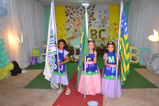 Em seguida, as crianças fizeram uma entrada especial acompanhadas de seus familiares, em um momento marcado por emoção e orgulho. Logo após, foram entoados os Hinos Oficiais, reforçando o caráter solene do evento.