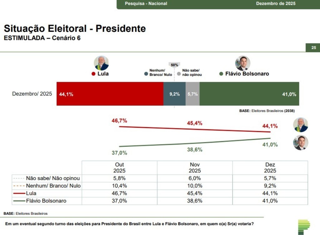 No mesmo período, Lula apresentou queda de mais de 2,5 pontos percentuais, saindo de 46,7% (outubro), 45,4%, em novembro, até chegar aos 44,1%.