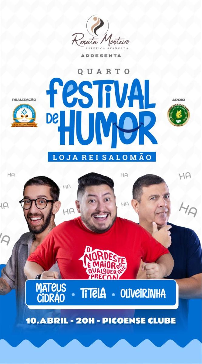 A Loja Maçônica Rei Salomão nº 48, Oriente de Picos, promove no dia 10 de abril, às 20h, o 4º Festival de Humor. O evento será realizado no Picoense Clube e promete reunir o público para uma noite de descontração, confraternização e solidariedade.
