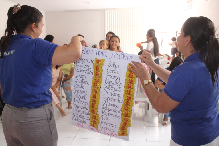 Dando continuidade à programação, foi realizada uma dinâmica voltada à valorização das mulheres, incentivando as participantes a expressarem palavras e características positivas que representam o universo feminino, promovendo integração e fortalecimento da autoestima.
