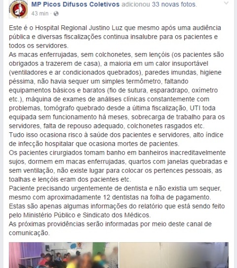 Mais uma vez o Ministério Público, através da 1ª Promotoria de Picos, voltou a denunciar as condições insalubres de funcionamento do Hospital Regional Justino Luz (HRJL).
