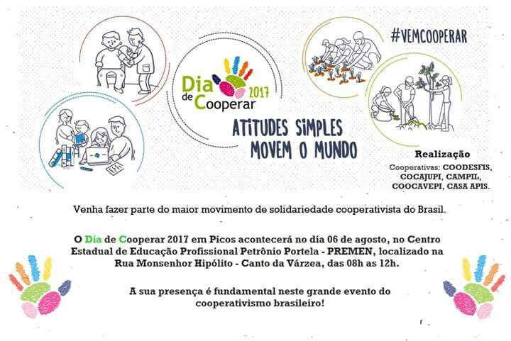Algumas cooperativas de Picos realizarão na manhã do próximo domingo, 06 de agosto, a terceira edição do Dia de Cooperar. O evento reúne entidades e parceiros cooperativistas em uma grande ação comunitária de promoção do cooperativismo e de iniciativas sustentáveis.