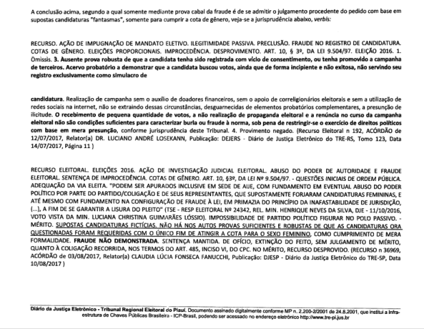 Um dos trechos da sentença ainda esclarece que o recebimento da pequena quantidade de votos sobre as candidaturas investigadas, a não realização de propaganda eleitoral e a renúncia no curso da campanha eleitoral não são condições suficientes para caracterizar fraude ao processo.