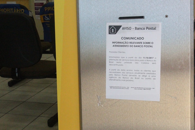 Um comunicado fixado no local informa aos usuários do serviço, que a partir data, os serviços bancários para o Banco do Brasil na unidade serão descontinuados e que os mesmos deverão procurar a agência bancária ou ponto de atendimento mais próximo.
