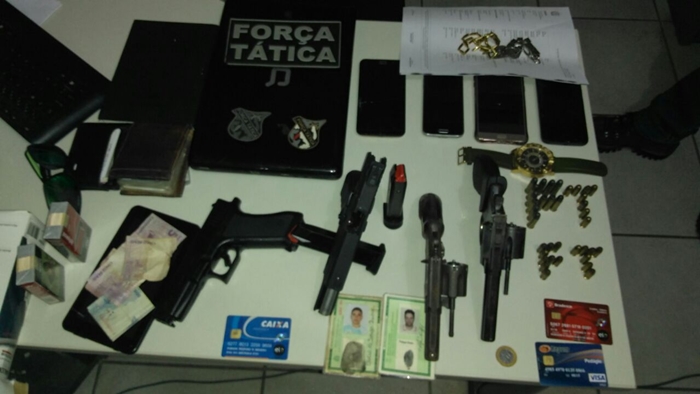 Com a dupla os policiais encontraram um revólver Taurus, dois revólveres calibre 38, um simulacro de uma Glock e no interior do veículo Voyage 1.6, de cor branca e placa JEF7360, foram encontrados os celulares, tablete e notebook roubados no supermercado do bairro Junco.
