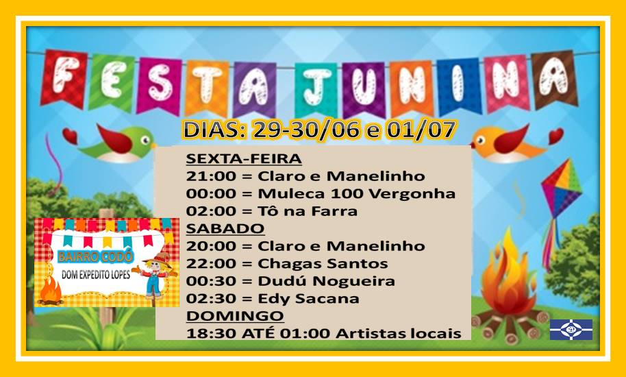A prefeitura municipal de Dom Expedito Lopes, através do prefeito Valmir Barbosa e de toda a sua equipe de governo, realiza de 29 de junho a 01 de julho a 32ª edição do São João do Bairro Codó.