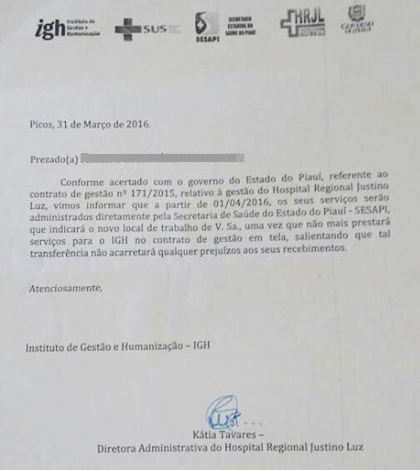 O documento informava que os servidores não mais exerceriam suas funções no HRJL, e que os seus serviços serão administrados diretamente pela Secretária de Saúde do Estado do Piauí- SESAPI.