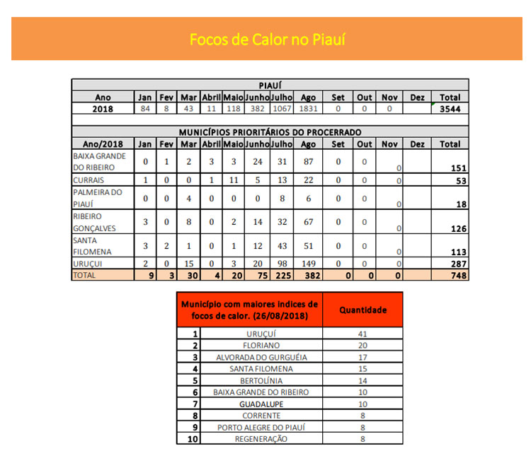 Uruçuí, Baixa Grande do Ribeiro, Ribeiro Gonçalves e Santa Filomena, todos no extremosul do estado, foram os que mais registraram focos de calor em 2018, principalmente neste mês.