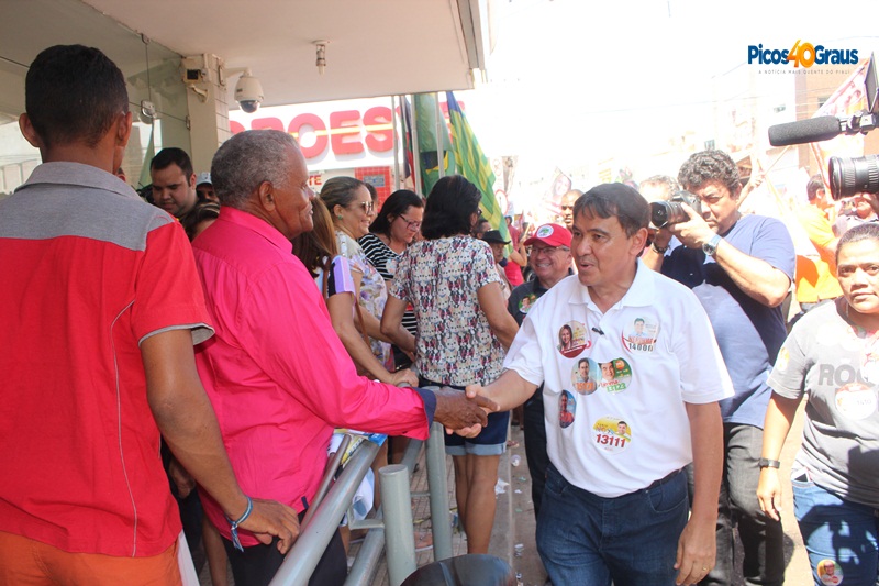 O governador Wellington Dias (PT) fez campanha “corpo a corpo” na cidade de Picos na manhã deste sábado, 08. Desde a sexta-feira ele tem andado pela região, conversando com prefeitos e lideranças. A sua comitiva era numerosa e contava com a participação dos candidatos ao Senado Federal Ciro Nogueira (Progressista) e Marcelo Castro (MDB), do deputado federal Assis Carvalho (PT), do candidato a deputado federal Mainha (Progressista) e dos deputados estaduais que buscam a reeleição Belê Medeiros (Progressistas), Severo Eulálio e Pablo Santos (MDB), Nerinho (PMDB) e o candidato a deputado estadual Coronel Carlos Augusto (PHS).