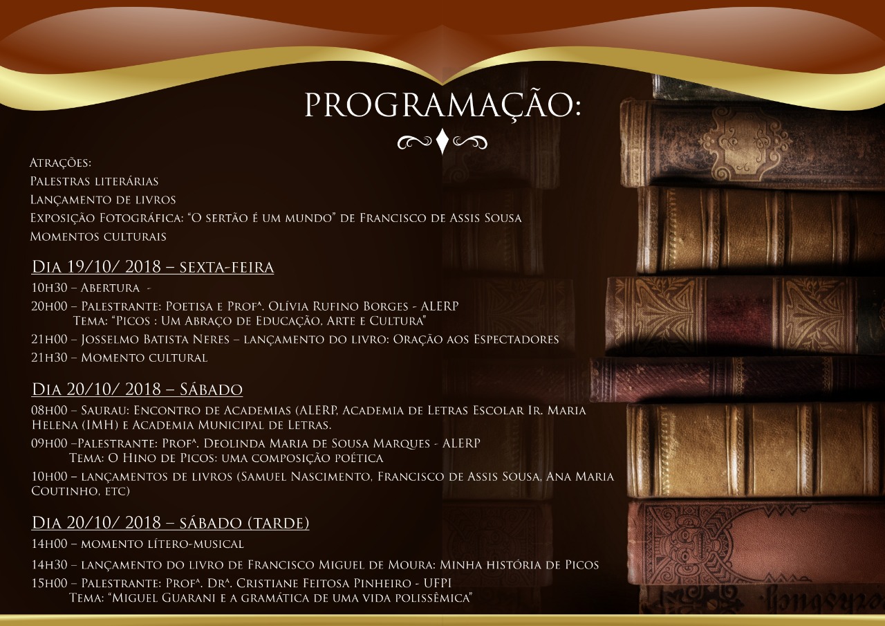 A Academia de Letras da Região de Picos (ALERP) realiza, nos dias 19 e 20 de outubro, o XII Seminário de Literatura Picoense. O evento deverá reunir membros da academia, escritores, estudantes e a sociedade em geral.