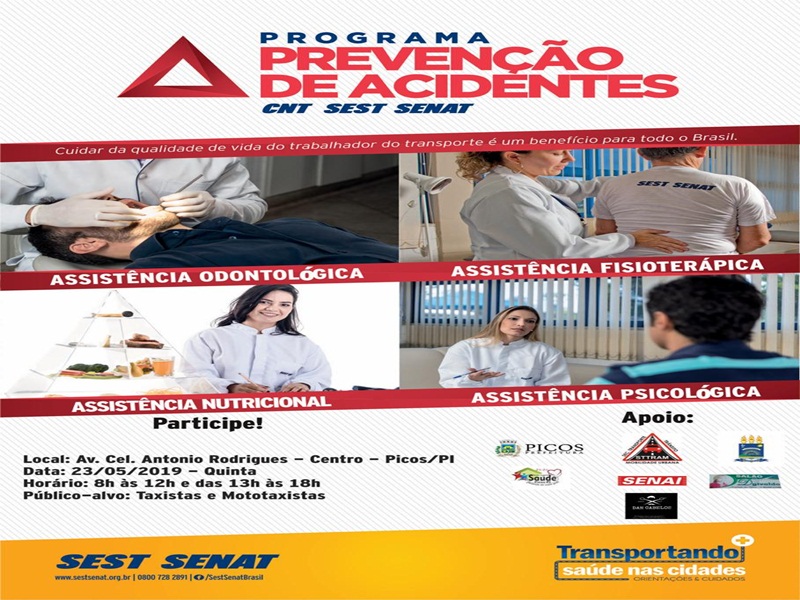 O SEST SENAT, atento às necessidades dos trabalhadores do transporte, leva, mais uma vez, atendimentos gratuitos de saúde a esses profissionais em seus locais de trabalho. A ação acontecerá em Picos nessa quinta-feira (23), na Rua Coronel Antônio Rodrigues, no Centro da cidade, das 8h às 12h e das 14h às 18h.