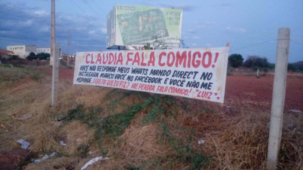 Após a faixa com o pedido de casamento fixada na passarela de Picos, mais faixas voltaram a ser colocadas me diferentes pontos da cidade. Desta vez, um homem que se identifica como Luiz pede perdão a uma mulher que se chama Cláudia.