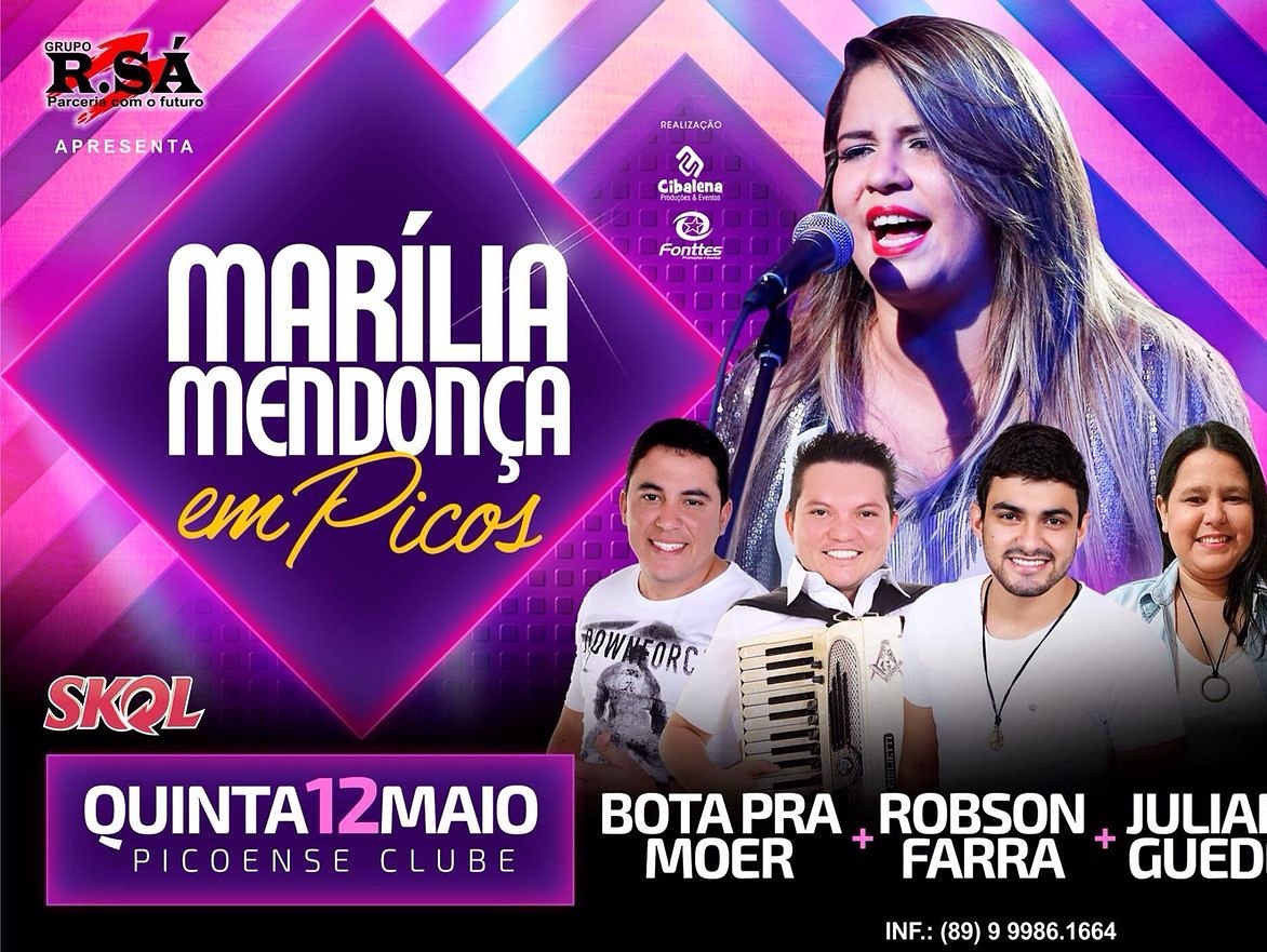 Nesta quinta-feira, 12, o Picoense Clube será palco da cantora Marília Mendonça e dos cantores Robson Farra e Juliana Guedes, além disso, a festa ainda conta com a apresentação de João Bandeira Junior e Bota pra Moer.