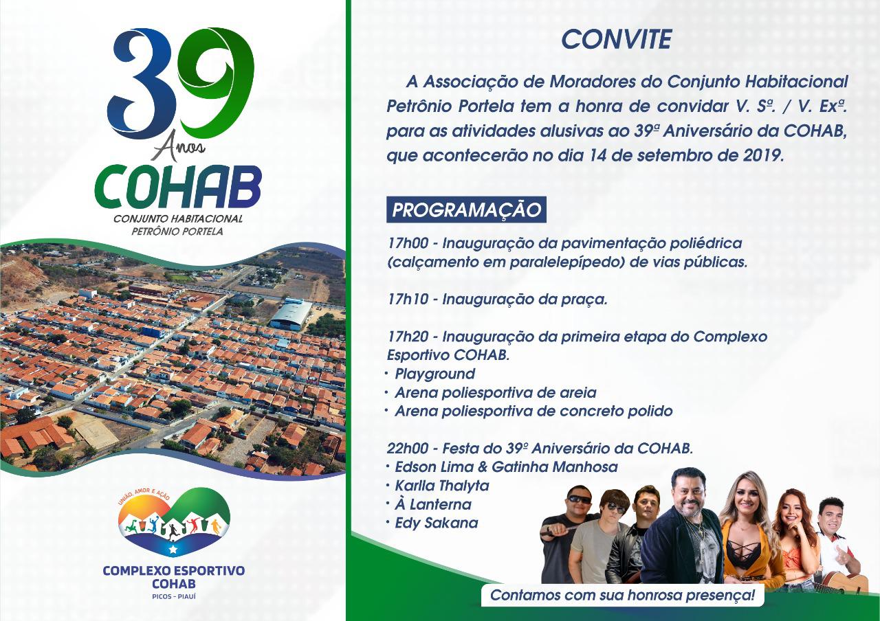 As inaugurações fazem parte da programação do 39º Aniversário da COHAB. E para comemorar a data, uma grande festa será realizada, tendo como atrações: Edson Lima & Gatinha Manhosa, Karlla Thalyta, À Lanterna e Edy Sakana.