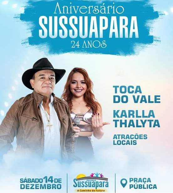 O município de Sussuapara, localizado na grande região de Picos, estará comemorando amanhã, dia 14 de dezembro, mais um aniversário de emancipação política e para marcar os seus 24 anos de existência a cidade vai receber um dos melhores cantores do Nordeste brasileiro, Toca do Vale, para realização de um grande show em praça pública.