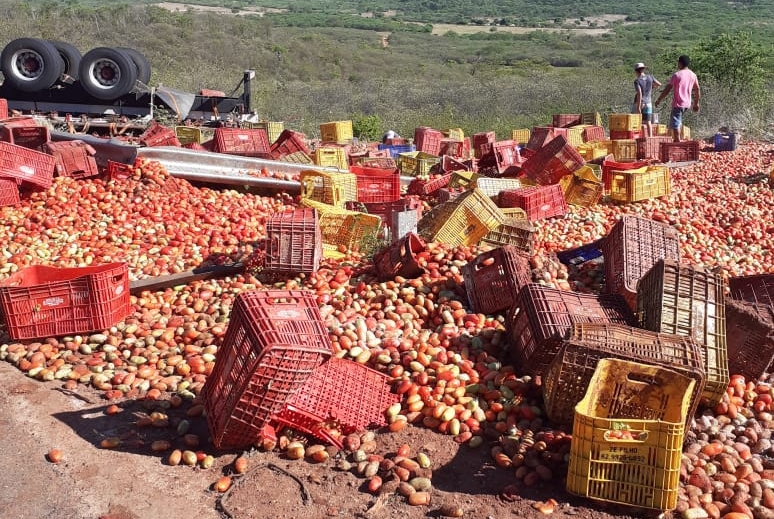 Na madrugada desde domingo, 15 de dezembro, um caminhão carregado de tomates tombou na curva do “S”, na BR-316 em Marcolândia.