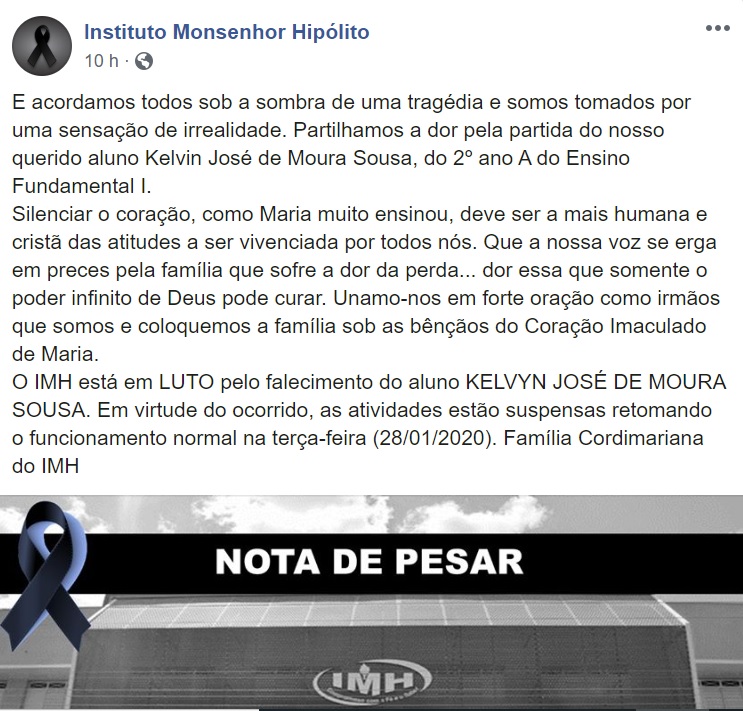Kelvyn Sousa estudava no 2° A do Ensino Fundamental I. Em nota, a direção da escola externa sua solidariedade à família, e comunica, que em decorrência do fato, nesta segunda-feira (27) as atividades escolares estão suspensas retomando o funcionamento normal na terça-feira (28).