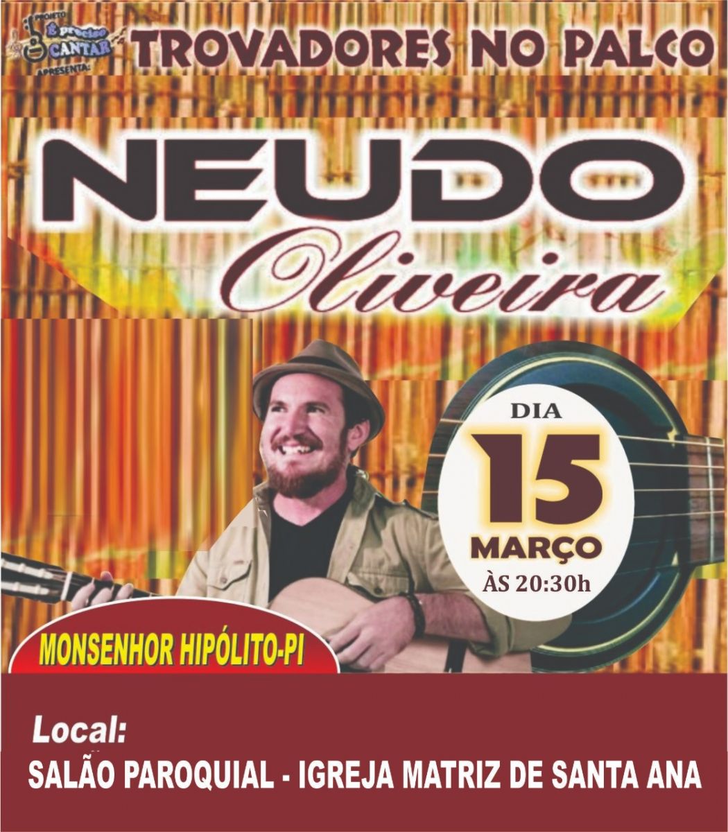 A Secretaria Municipal de Cultura de Monsenhor Hipólito, receberá na noite deste domingo, 15 de março, no salão paroquial da Igreja Matriz de Santa Ana, o projeto musical “Trovadores no Palco”, numa parceria com o cantor, violinista e trovador gaúcho, Pedro Munhoz, além da psicóloga Graça Moura, Odorico Carvalho, Samuel Brito, Josineide Costa, Marli Caetano e Vilebaldo Rocha.