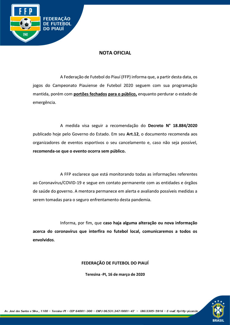 Em nota divulgada na tarde desta segunda-feira (16), a Federação de Futebol do Piauí (FFP) decidiu que o Campeonato Piauiense continuará a ser disputado, mas sem presença de torcedores.