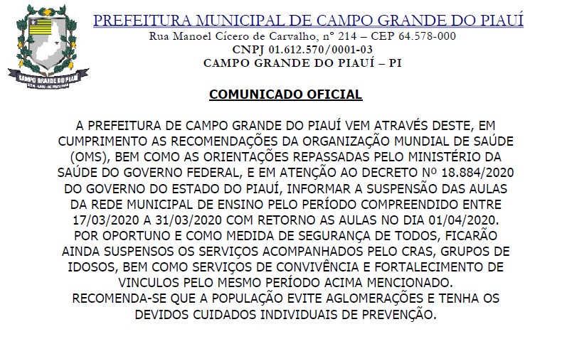 Seguindo orientação do Governo do Estado do Piauí, a Prefeitura de Campo Grande do Piauí, decidiu paralisar atividades no município. A partir desta terça-feira (17) e seguindo até o dia 31 de março, estão suspensas as aulas da rede municipal e a realização de eventos e atividades coletivas.