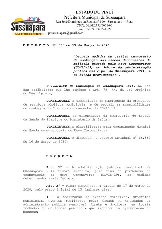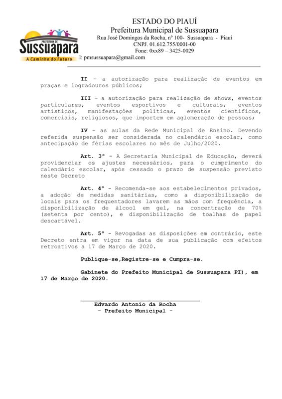 Confira a íntegra do Decreto assinado pelo prefeito de Sussuapara:
