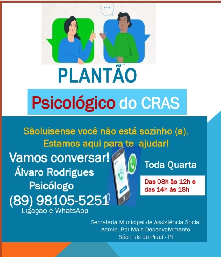 O psicólogo Álvaro Rodrigues, atenderá às quartas-feiras, através do telefone (89) 98105-5251.