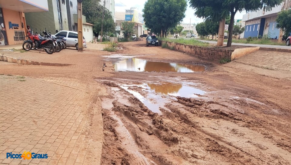 Clientes do banco e de outros empreendimentos localizados no prédio, estão tendo dificuldades para estacionar no local, uma vez que a via apresenta buracos e muita lama.