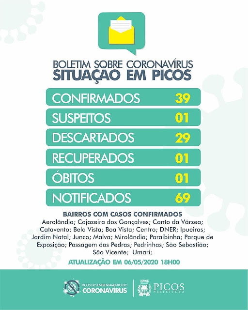 A Secretaria de Saúde de Picos, por meio de boletim divulgado nesta quarta-feira (6), informou mais sete casos de Covid-19 na cidade. O município conta agora com 39 casos confirmados de coronavírus.