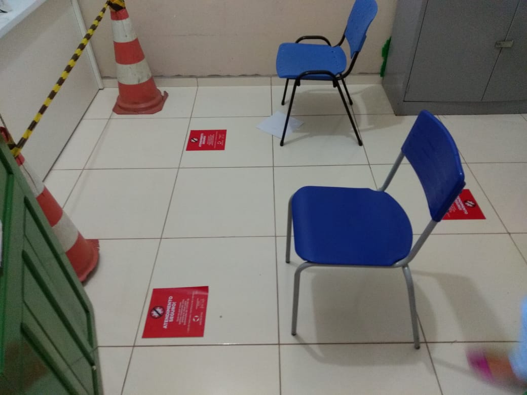 Além da instalação dos totens, a Prefeitura sinalizou os ambientes públicos com adesivos orientando o distanciamento seguro nas filas de espera.