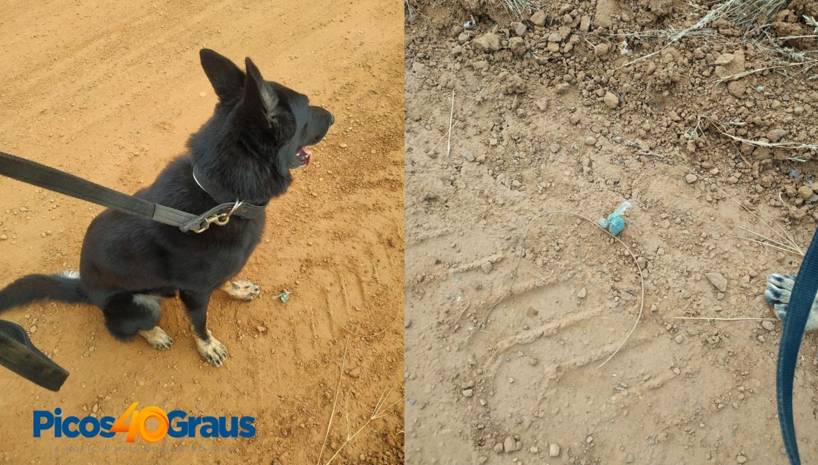“Pela manhã policiais militares realizaram rondas com o cão “Ganz” nas imediações da chácara. O mesmo apontou a localização de um invólucro com uma substância análoga a maconha. Acreditamos que alguém dispensou no momento da abordagem”, explicou o tetente.