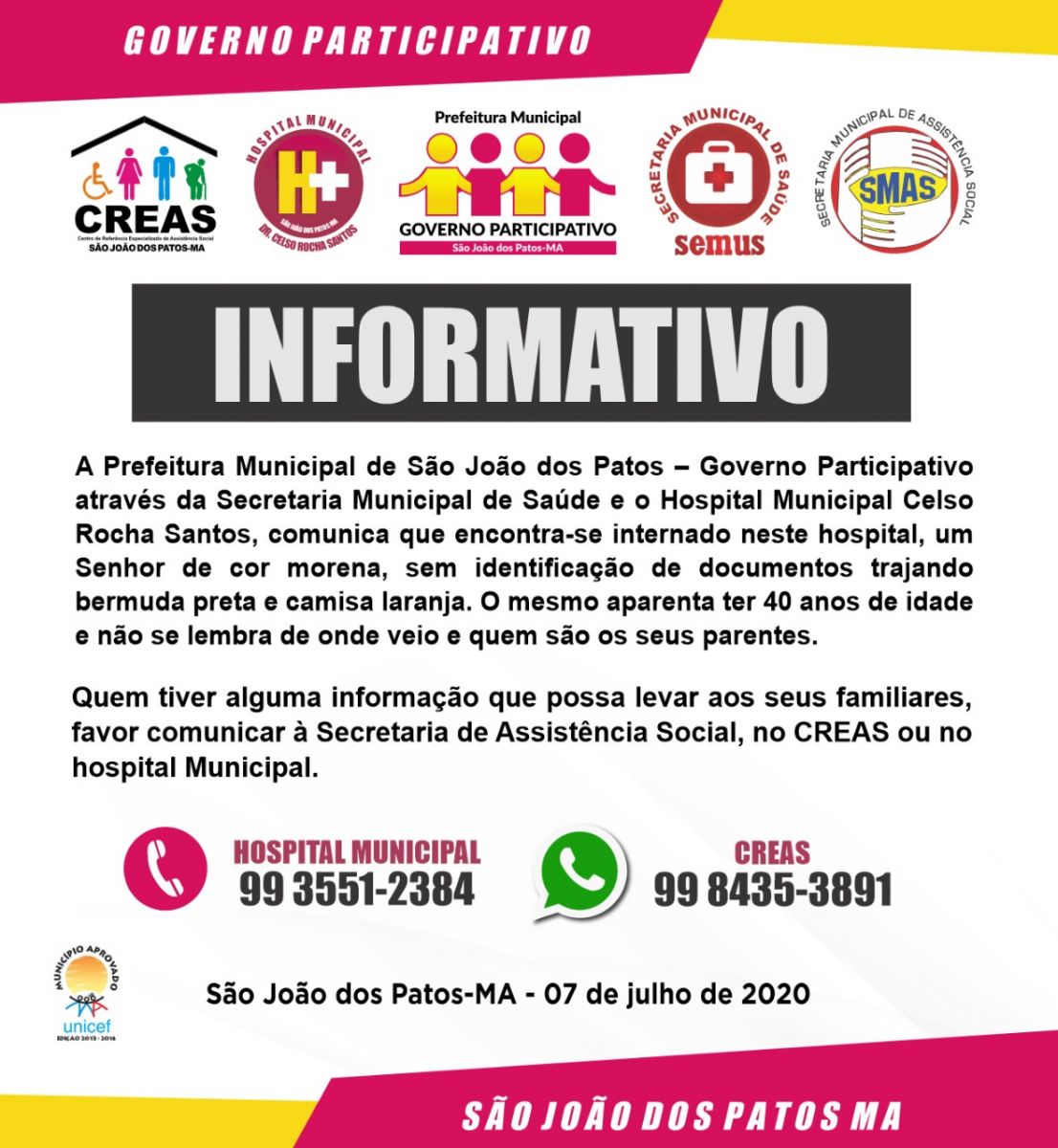 Há dois dias , um homem não identificado, está internado em um leito do Hospital Municipal Celso Rocha Santos,  em São João dos Patos, Maranhão, localizado a cerca de 292 quilômetros de Picos.