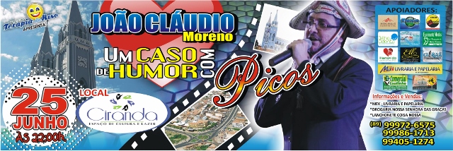 O Projeto Terapia do Riso confirmou a apresentação do humorista João Claudio Moreno para o próximo dia 25 de junho, no Ciranda – Espaço de Cultura e Lazer, em Picos, com o show “Um caso de humor com Picos”. A atração prevista inicialmente para o dia 16 de abril foi adiada depois que o humorista adoeceu, mas o quadro de gripe e febre se agravou e evoluiu para uma pneumonia, o que fez com que o show remarcado para 30 de abril fosse adiado mais uma vez.
