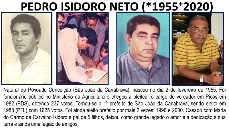 Pedro Isidoro Neto exerceu o cargo de secretário de Administração na Prefeitura de Picos, na primeira gestão do ex-prefeito Abel de Barros Araújo (1983-1988). Foi eleito em 1988 como o primeiro prefeito de São João da Canabrava, município emancipado de Picos. Ele foi eleito para mais dois mandatos consecutivos em 1996 e em 2000. Com o seu apoio também foram eleitos João Manoel da Silva, em 1992 e Maria Anita da Silva Pereira, em 2004, ambos já falecidos.