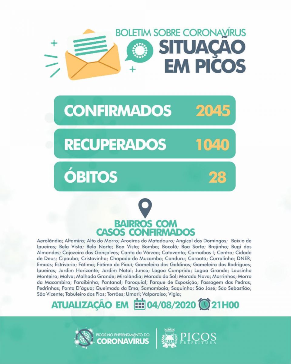 A Secretaria Municipal de Saúde de Picos informou, através de boletim divulgado na noite desta terça-feira (04), que o município registrou 60 novos casos de covid-19. Com os novos diagnósticos o total de infectados no município chegam a 2.045.