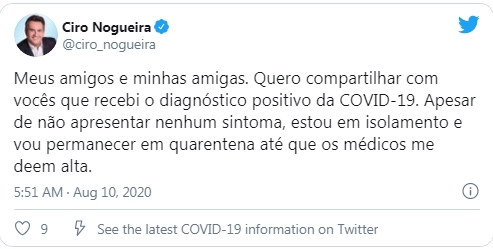"É um momento em que todos devemos nos proteger ao máximo e, principalmente, confiar em Deus. Sigo trabalhando pelo nosso Piauí. Um abraço", completou Ciro Nogueira.
